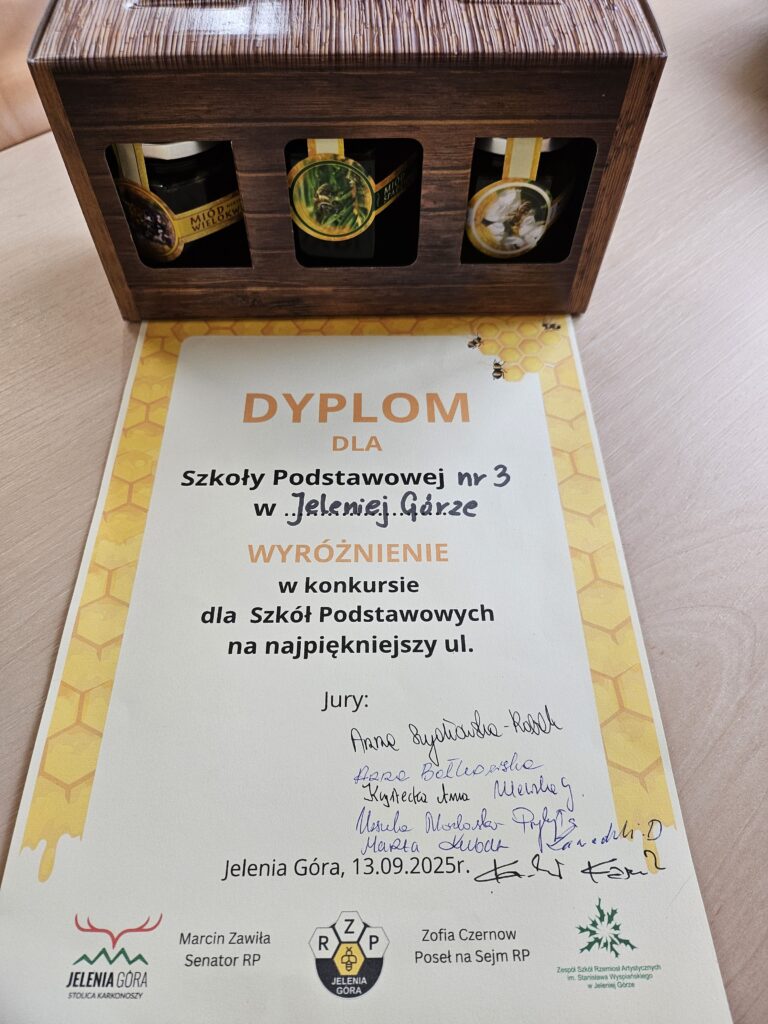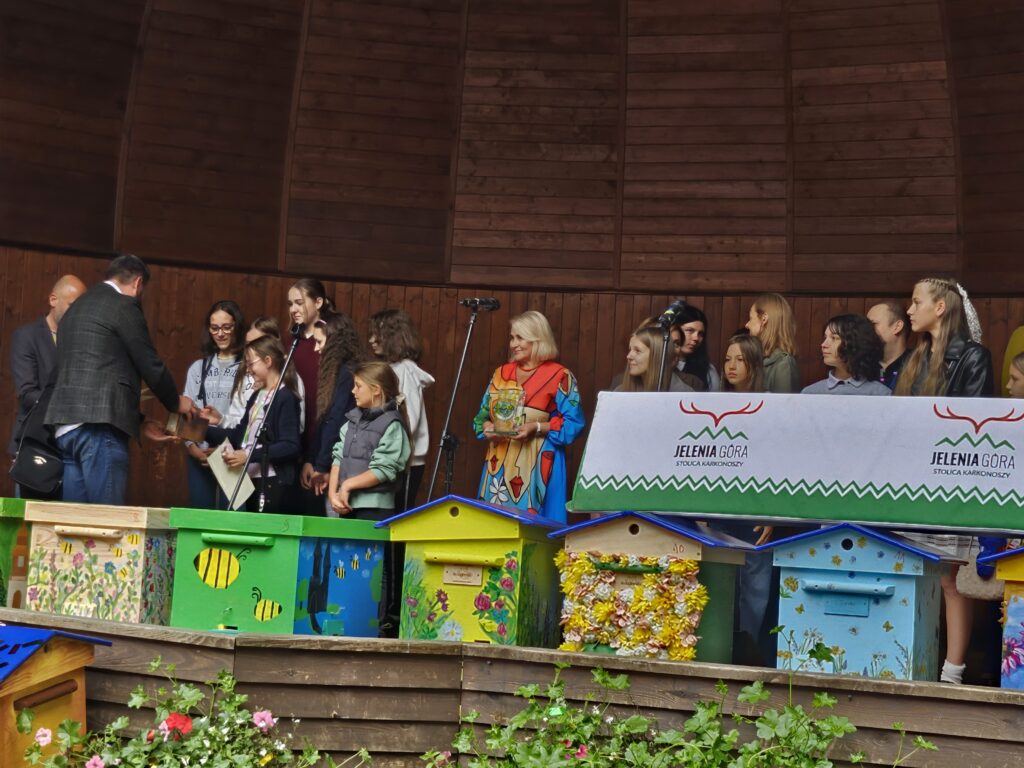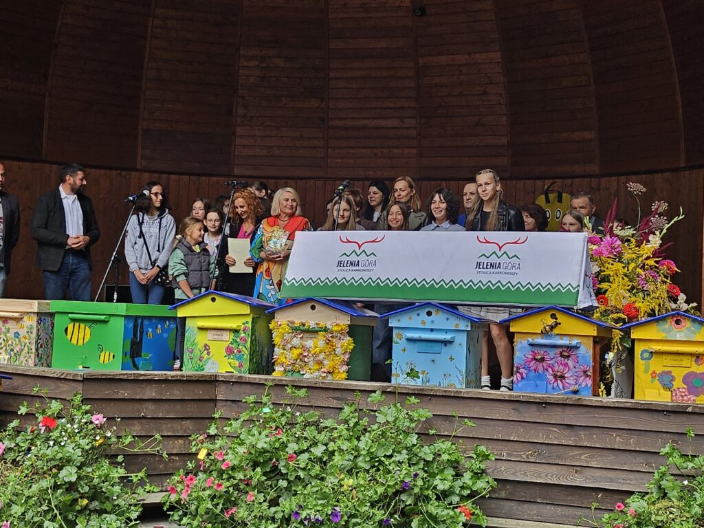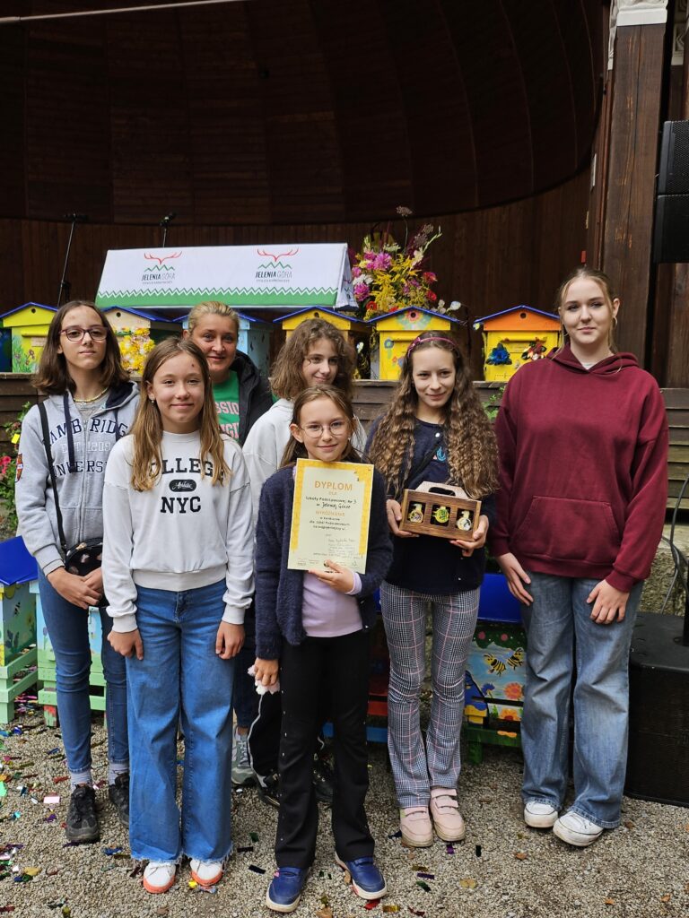W sobotę 13 września podczas Międzynarodowych Warsztatów Pszczelarskich 2025 odbyło się rozstrzygnięcie międzyszkolnego konkursu na „Najpiękniej Pomalowany Ulik”. Każda szkoła w Jeleniej Górze otrzymała drewniany ul do pomalowania, który miał przybliżyć dzieciom i młodzieży jak duże znaczenie dla naszego środowiska mają pszczoły. Uczniowie naszej szkoły zdobyli wyróżnienie za udekorowanie ula. Serdecznie gratulujemy.