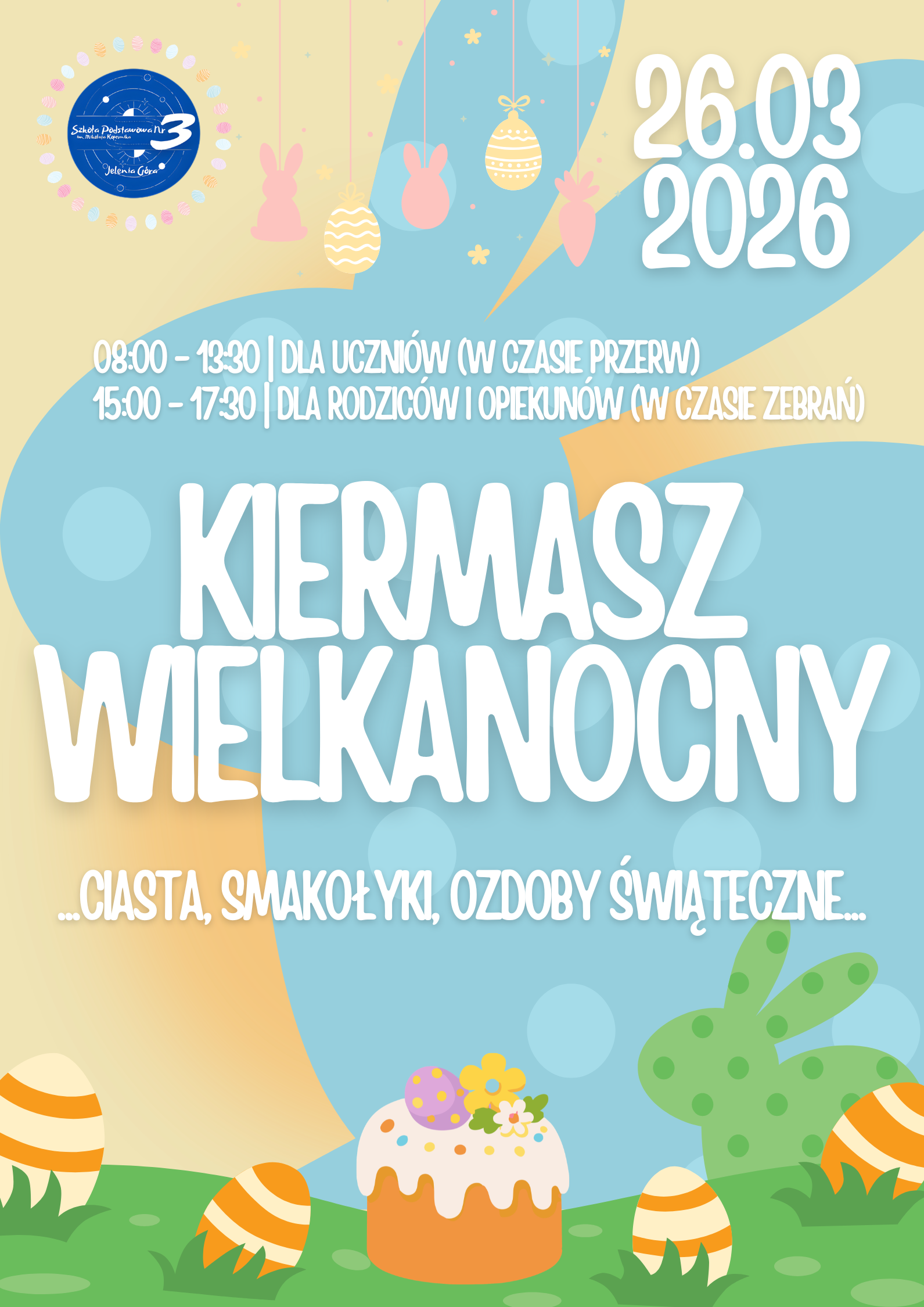Już w czwartek, 26 marca 2026 r., nasza szkoła wypełni się zapachem ciast i blaskiem kolorowych pisanek! Serdecznie zapraszamy całą społeczność szkolną na wyjątkowy Kiermasz Wielkanocny.